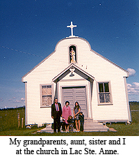Our own more immediate family traces its recent history from the Metis community of Lac Ste. Anne, Alberta. Lac Ste. Anne was originally a gathering place for Metis and Cree families during the summer buffalo hunt. In the fall they would leave to go to their winter camps. The lake was originally named Manito Sakahigan (Spirit Lake).