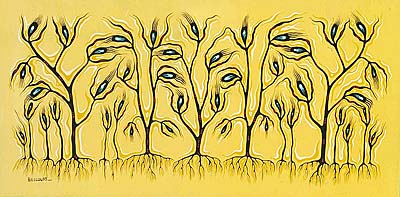 The white and yellow outlines that border the black stems of the flowers symbolize the spirit realm. These ‘spirit lines’ surround the community and act as a positive force - an energy that encourages our people to continue through adversity.