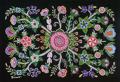 The central flower in this painting is taken from a photograph of an old pair of gloves embroidered in a traditional Metis style (I think called the “Norway House Style”). It was made to emulate the complex and prolific beadwork style of historic Métis beadwork and embroidery. Suggested within the painting is the shape of the infinity symbol, the infinity symbol is the symbol found on the Métis flag. For Metis people it means the joining of two worlds into a nation forever.