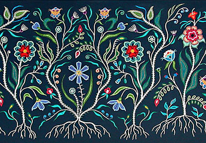 Some of the flowers are direct facsimiles of flowers found in historical Aboriginal beadwork. Others, such as the large abstract flowers, are reminiscent of prairie Métis beadwork where artisans traditionally added multi-layered rows of petals on each flower until the flowers become heavy with layers and colour. And others still are representative of actual plant species such as the Blue Eyed Grass, Milkweed or Wild Carrot.