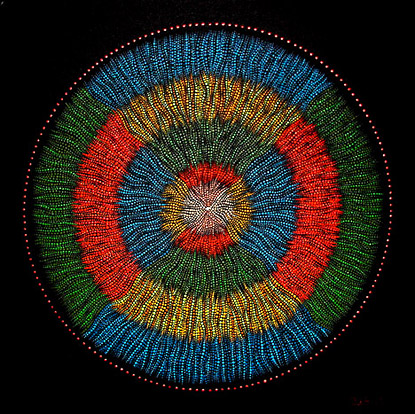 The white dot in the centre symbolizes the "source" of all life, the Great Spirit, the one-ness from which we came and to which we return. In the painting, the centre is small because the mystery of life itself is too immense for us to truly comprehend. The wavy lines are the flow of existence like waves of a tide, and movement from the source into our universe. From the white dot at centre emerges an umbilical like wire of beads and shell representing our birth from the spirit world into the physical world we know in life. |