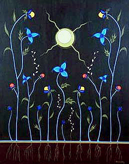 Not a very good copy, but it marks a transition in my work. I started including roots and renditions of actual plants. In this instance the trillium and the pussy willow. This was the last painting I did that included the sun/moon.