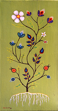 This is the first painting I did where I would say you can see the beginnings of the style that I've carried through the rest of my work. No longer is the sun/moon or the ground line visible. At this point I was spending a considerable amount of time studying plants, observing them to see how they grew. I was also spending a great deal of time with Elders Yvonne McRae and her brother Wilfred Peltier. Yvonne's home was filled with woodland art and I can see how the colours used by woodland artists began to enter into my work.