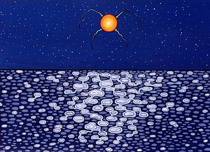 One night in my dream, I saw a painting of water. This was how the water looked. I painted this after an evening spent in Wiky during powwow weekend. We were all visting in Mary Fisher's tipi on Gordy Odjig's property at the beach. It was a perfect night as we could hear the drummers singing in over the water.