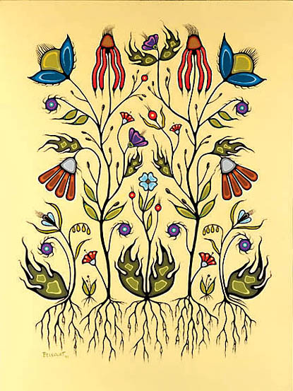 In both instances or interpretations, the roots represent the idea that there is more to life than what is seen on the surface and that our heritage has a great influence over our lives. There are lines which connect the plants indicating our own interconnectedness with all of Creation. The flowers reach upwards as we seek out our individual spirituality and look to our future as Aboriginal Peoples.