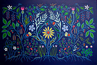 In this piece the important plants depicted are sage, raspberry, blueberry, chives, saskatoon berries, chokecherries, birch catkins, strawberries, wild blue flax, clovers, moss, and the thistle.