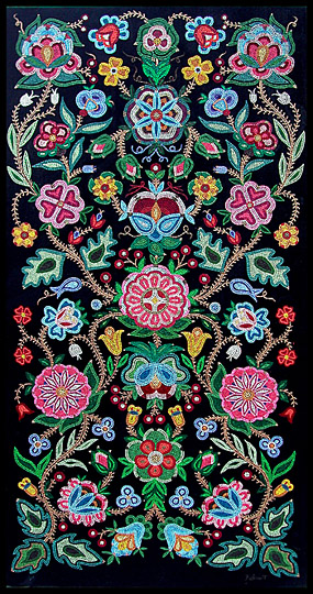 Done on a black background to emulate traditional Metis beadwork done on black tradecloth, the panel features styles/patterns and colours found in historic beadwork which is commonly referred to as the “subarctic” style.  I wanted to capture not only the aesthetic view of this style of beadwork, but also to capture the Metis spirit of dance and celebration.