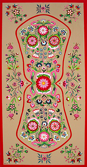 This piece features the unique patterns of embroidery found only in Manitoba. In the mid to late 1800’s, Metis women in Manitoba created their own style of embroidery sewn on hide. The larger flowers are what are commonly referred to as the “Norway House” style and the smaller flowers are known as the “Winnipeg small flower style”. The red lines that are common within many of the pieces in this series are reflective of the red trade cloth that was commonly sewn as piping or onto the borders of beadwork. The red tradecloth is frequently found in historic items in First Nations as well. Red to me represents the blood of the people, but the idea that is stemming from trade cloth evokes feelings within me that are both good and bad about our history – you know, we prospered greatly at the time from trade, but in the end, where did it leave us?