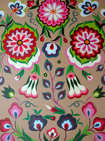 This piece features the unique patterns of embroidery found only in Manitoba. In the mid to late 1800’s, Metis women in Manitoba created their own style of embroidery sewn on hide. The larger flowers are what are commonly referred to as the “Norway House” style and the smaller flowers are known as the “Winnipeg small flower style”. The red lines that are common within many of the pieces in this series are reflective of the red trade cloth that was commonly sewn as piping or onto the borders of beadwork. The red tradecloth is frequently found in historic items in First Nations as well. Red to me represents the blood of the people, but the idea that is stemming from trade cloth evokes feelings within me that are both good and bad about our history – you know, we prospered greatly at the time from trade, but in the end, where did it leave us?