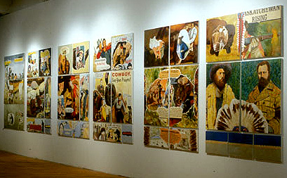 "...Garneau's work also delves into the issues surrounding existing stereotypes of Aboriginal people, and how we internalize them when coming to terms with our ancestry. In How the West Was... Garneau has created a history painting about the settlement of the Canadian Plains using images taken from non-Aboriginal art historical and pop-culture sources. The work is reminiscent of other Aboriginal artists investigation into the impact of stereotypes, perpetuated by the use of Cowboy and Indian imagery, dime novels, etc. However Garneau expands the issue, by introducing his own family history into the stereotypical imagery, thus his personal stake, while acknowledging that Métis culture has also had to endure stereotypical ideals - an aspect that hasn't really been researched by these other artists."