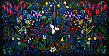 In this piece the plants depicted are trillium, cattail, blueflag, milkweed, maple, sumac, pine, plantain, lady slippers, pickerel lily, jack-in-the-pulpit, fiddleheads, sundew, strawberry, raspberry and bluberry - and as a nod to his childhood - buttercup.